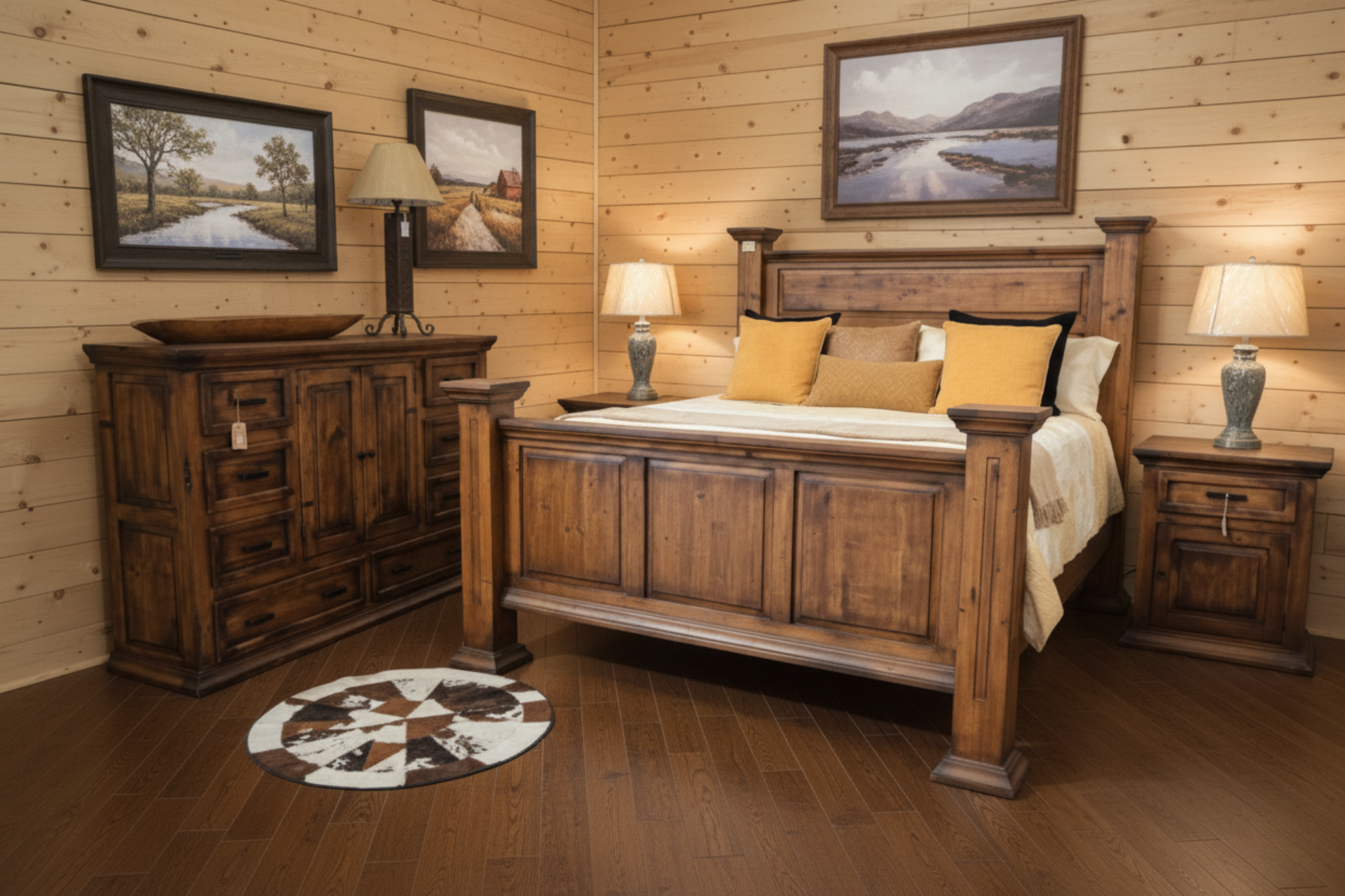 The Floresville Bedroom Set brings together Rustic charm with a Modern feel. It features a mix of smooth and rough textures and Modern Drawer Pulls and Drawer Slides. Available in 4 Wood Stain options- Old West, Walnut, Oldie Toasted, and Chestnut.