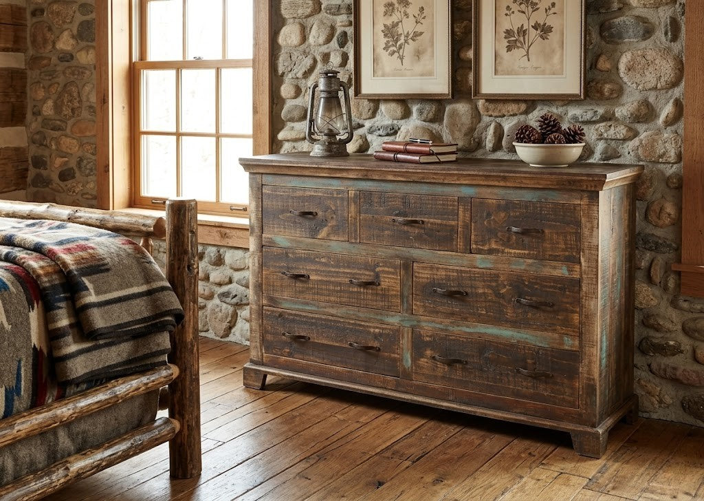 The Cabana Bedroom Set is Rustic with an Island flare inspired by the beach towns in the Western Caribbean. It features a distressed finish and 7 Drawers for ample storage. Available in different colors.