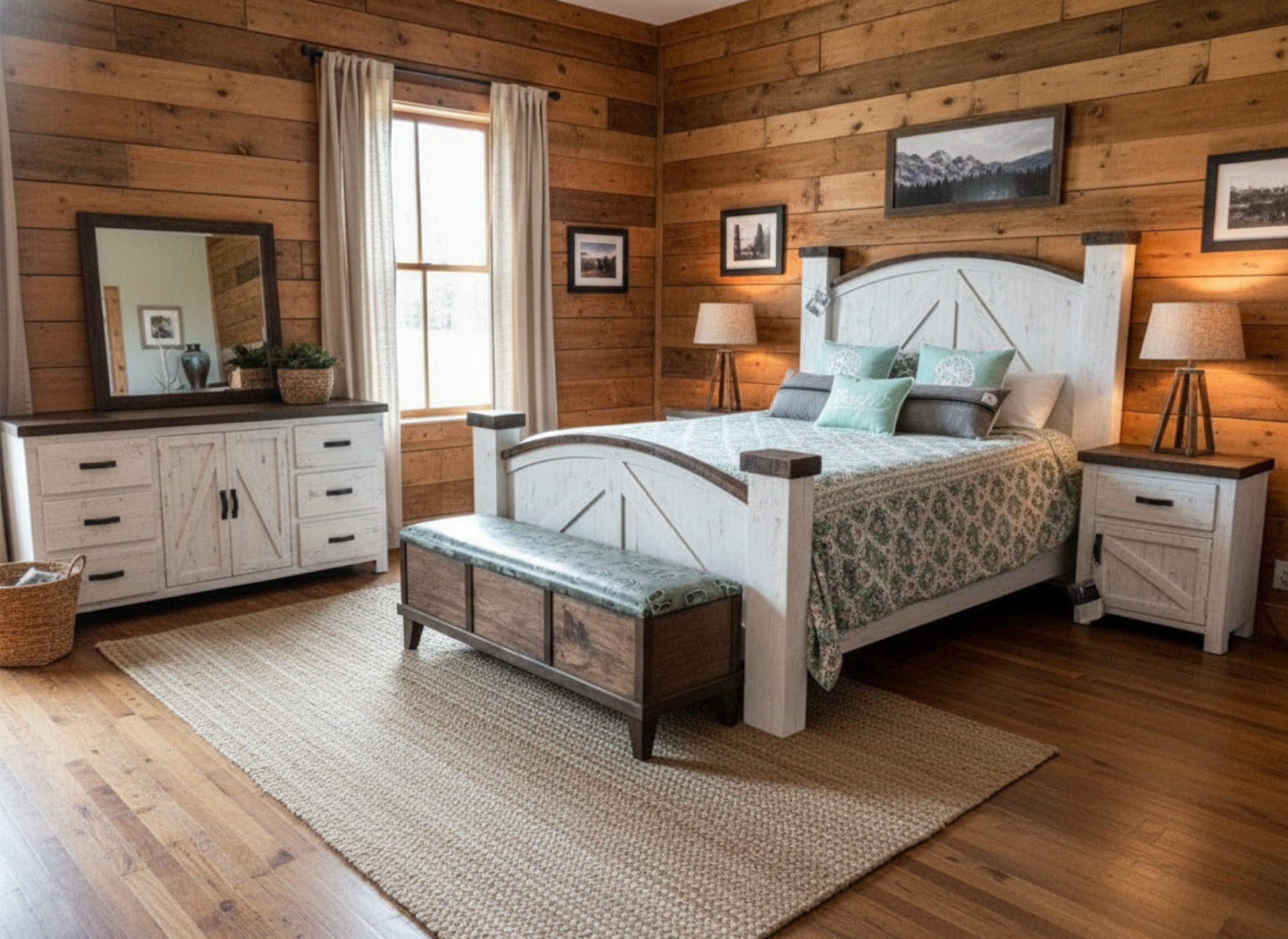 The Rustic Ranch Mansion Bedroom Set has Rustic charm with Farmhouse style. It features a Barn Door Design, curved headboard and footboard, and a beautiful, distressed finish.  Available in many colors.