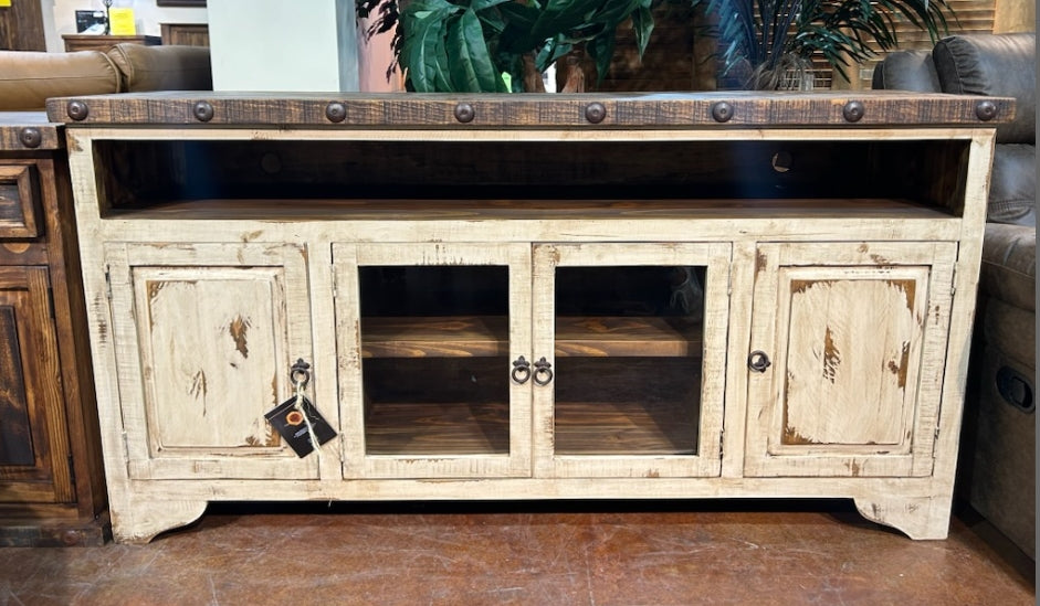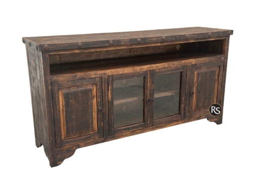 The Rustic 70" TV Console combines sturdy craftsmanship with a charming rustic design, featuring a spacious surface to accommodate large TVs. Its glass door panels offer both style and visibility, perfect for displaying media devices or decorative items while keeping them protected from dust. This console provides ample storage with well-designed compartments to keep your living space organized and inviting. Ideal for enhancing rustic or farmhouse-inspired interiors with practical functionality.
