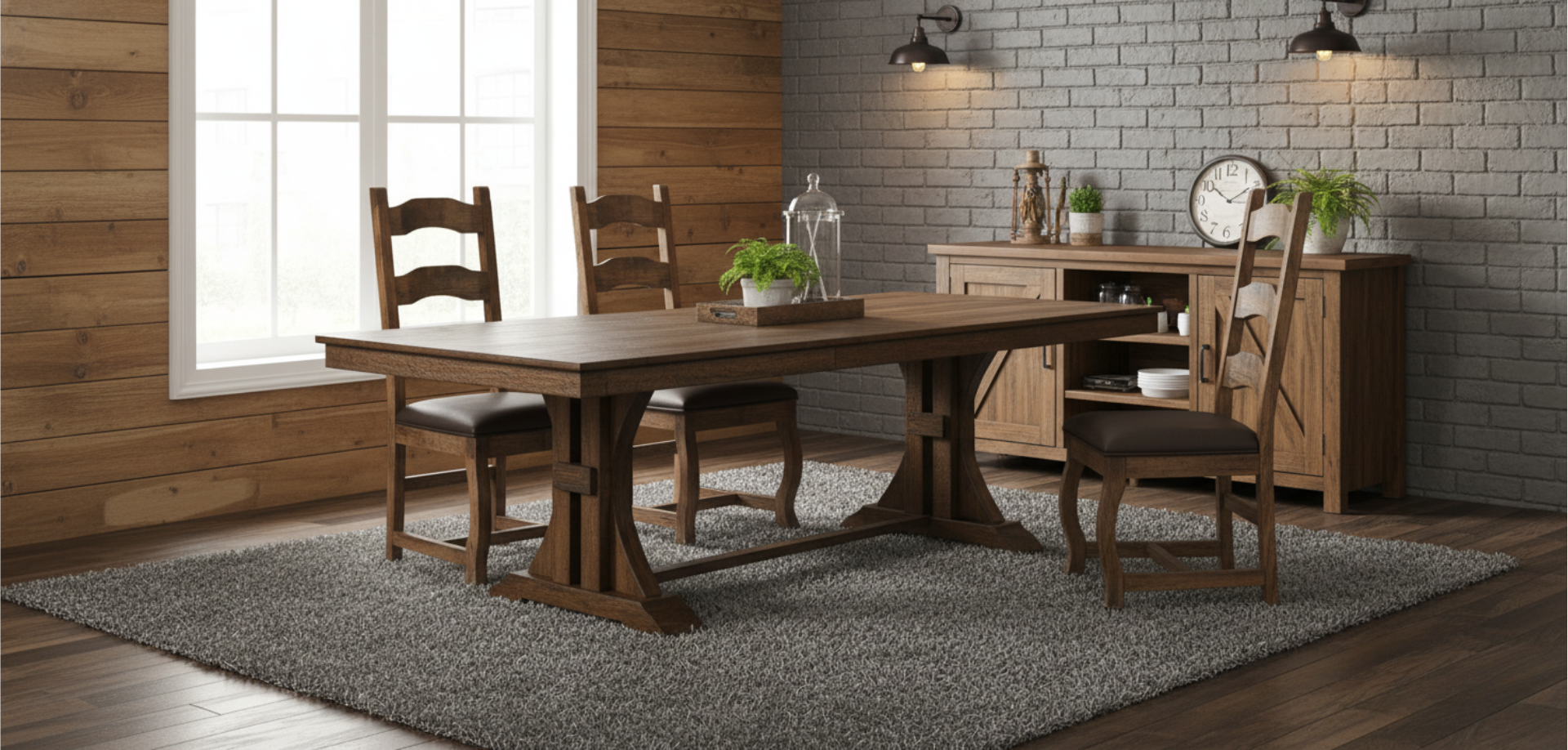 The Floresville dining set has a rustic style inspired by the Old West and Texas Hill Country. It features metal banding and a trestle base. Available in different Premier Wood Stains.