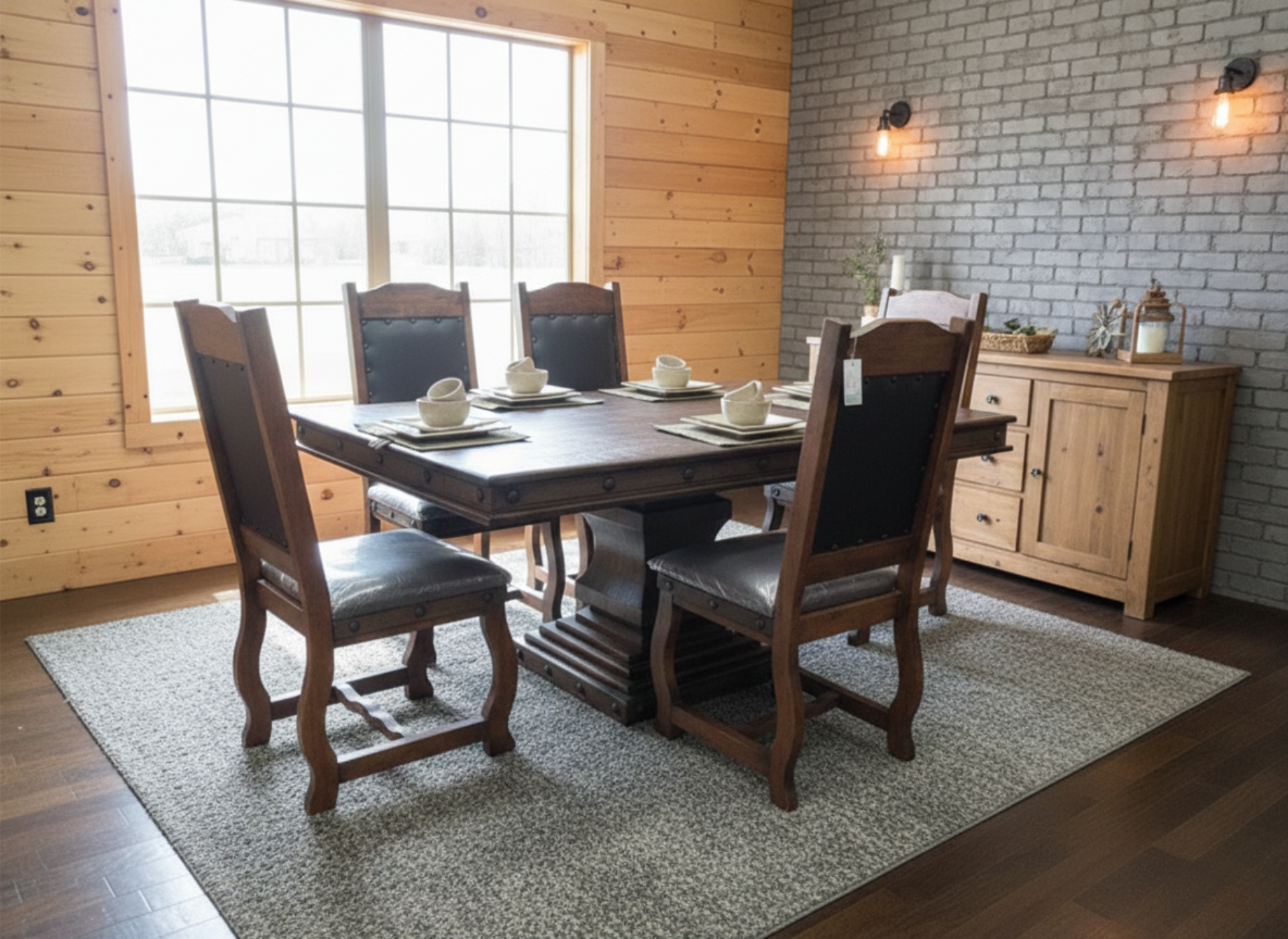 The Grand Hacienda 6 Ft Dining Set has a Rustic style inspired by the Old West and Texas Hill Country. It features metal banding and decorative nail heads along trim, and a Pedestal Base, Available in different Premier Wood Stains. (Also available in 8 Ft)