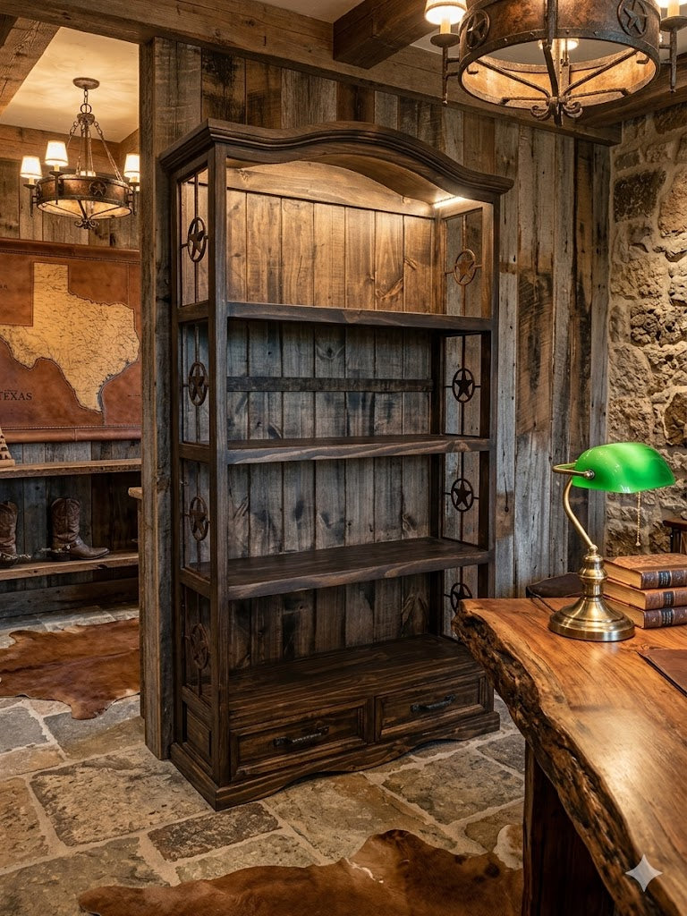 The Iron Star Bookcase is truly rustic with it's intricate and rustic metal design work featuring metal stars along the sides of the bookshelf and two bottom drawers for storage. Available in many finish options.