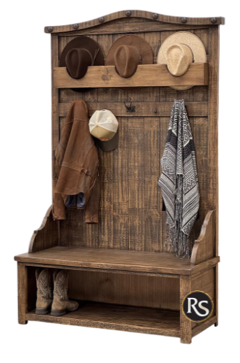 The Ranch Hall Tree brings rustic style to your entryway with a built-in bench, storage compartment, coat hooks, and hat display. Available in multiple finishes to suit your décor.