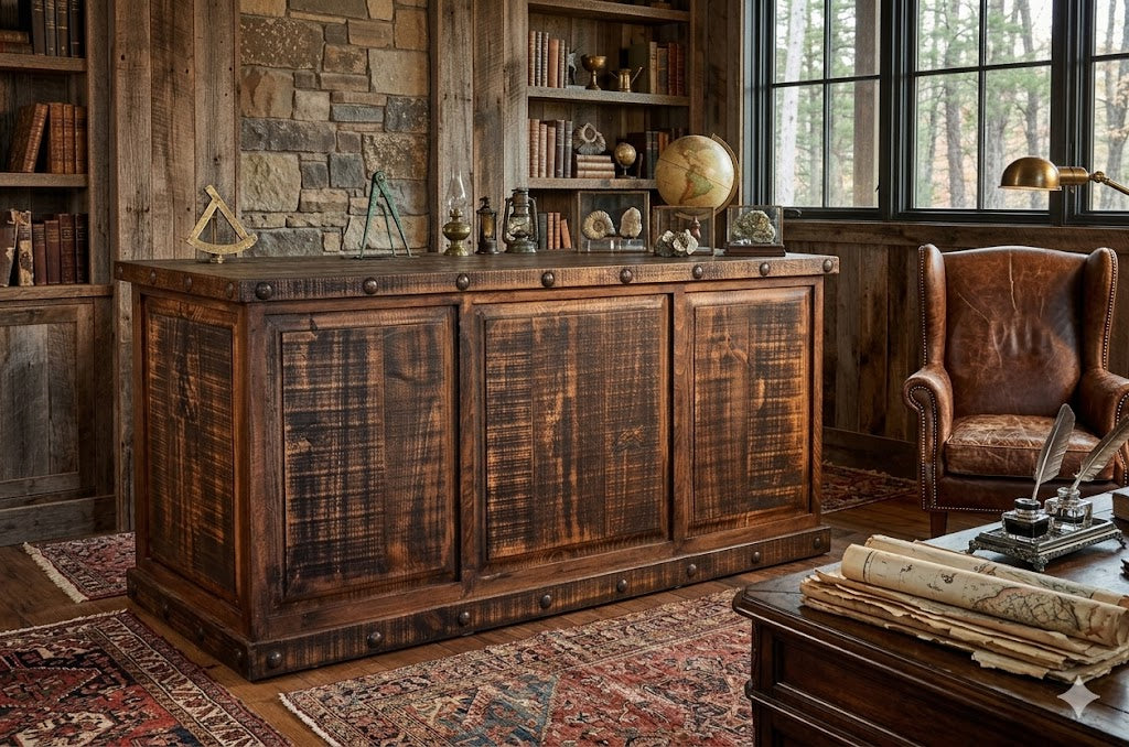 Our RUSTIC EXECUTIVE DESK showcases a unique design with wood cut against the grain and stained in a dark finish. The dark nail heads give it a rustic touch. Various stain options are available for an added fee.