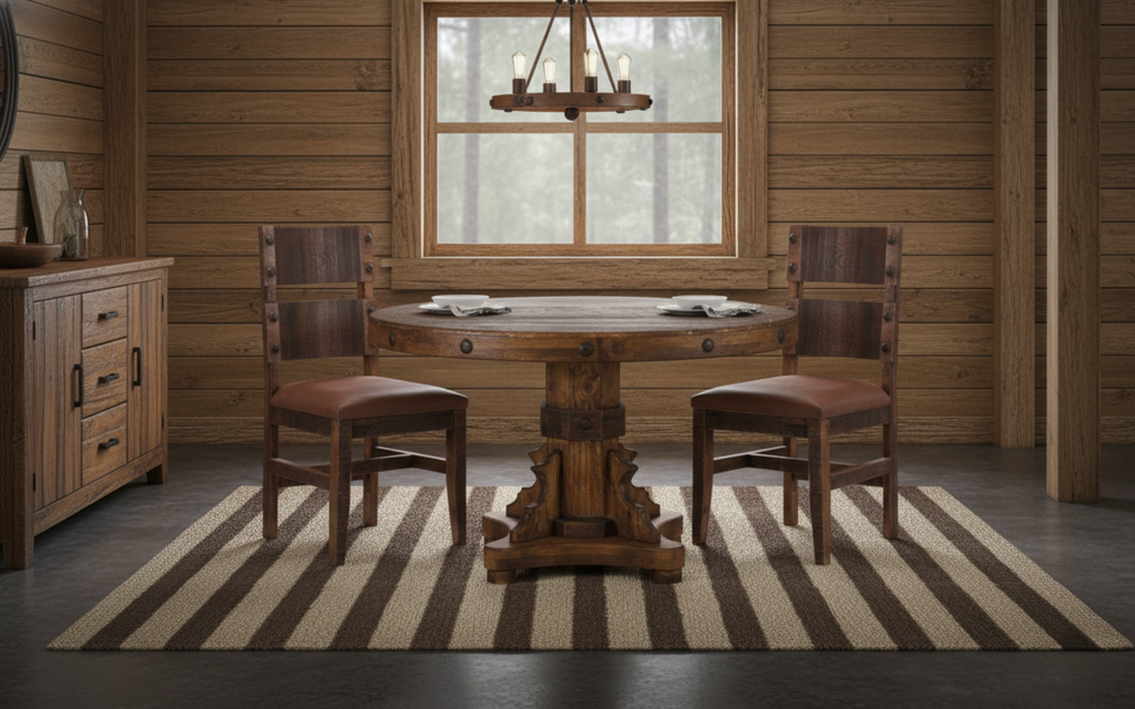 Enhance your dining area with our 50-inch round Brazilian pine table. Meticulously cut against the natural grain, it boasts a rugged and rustic aesthetic enhanced by a deep stain and dark nail heads along the edges. This set also comes with 4 charming chairs featuring cozy cushions. Looking for a different style? Browse our selection of chair designs and finishes to find your perfect match. Like all of our products, each piece is meticulously handcrafted and custom-made for a one-of-a-kind addition to your home.